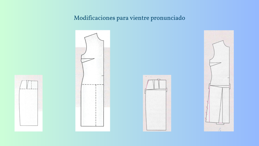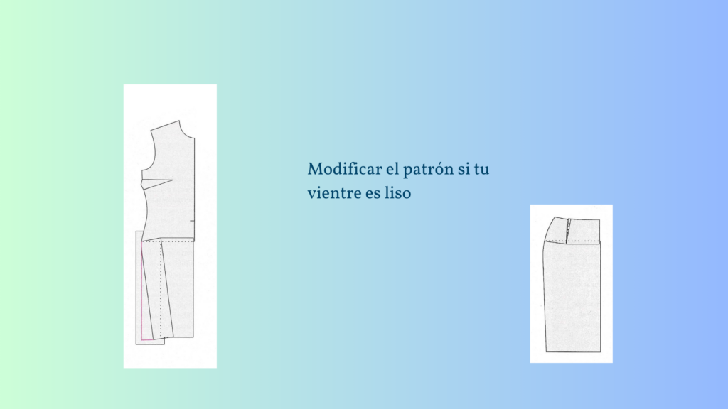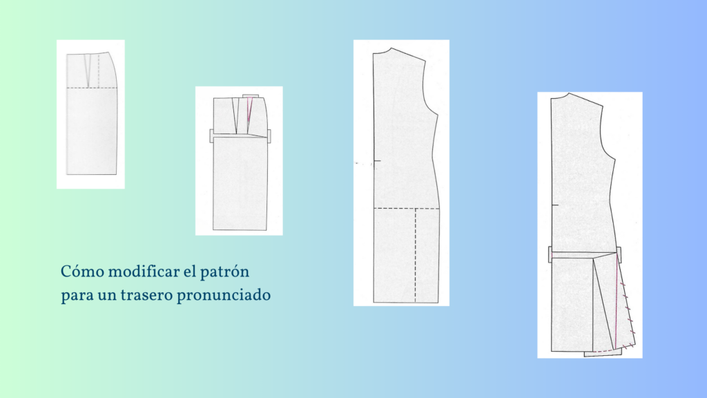 Si tu caso es el contrario del anterior, o sea, tu trasero es plano, las piezas se acortarán en el centro de la espalda de la falda o vestido.