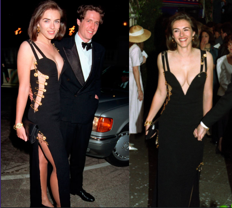 El vestido de seda negra con imperdibles dorados que lució Elizabeth Hurley en 1994 es uno de sus diseños más famosos que consolidó la firma en el mundo del espectáculo.