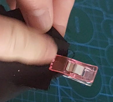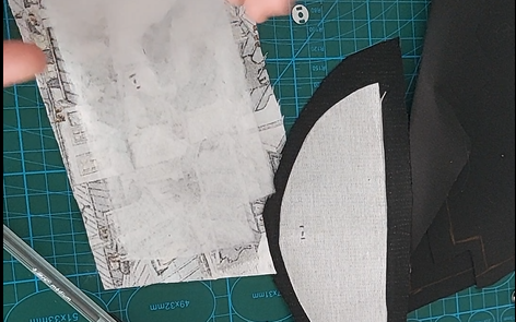 Vamos a colocar las dos piezas de la solapa derecho contra derecho y aseguramos bien con alfileres o pinzas o como prefieras, solo en la parte curva.