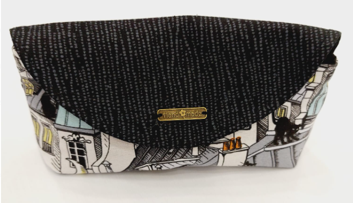 - Dos trozos de tela para la solapa de 18 cm de ancho y 9 cm de alto, nosotros hemos puesto la misma tela en el interior y el exterior, la de tono sobre tono negra