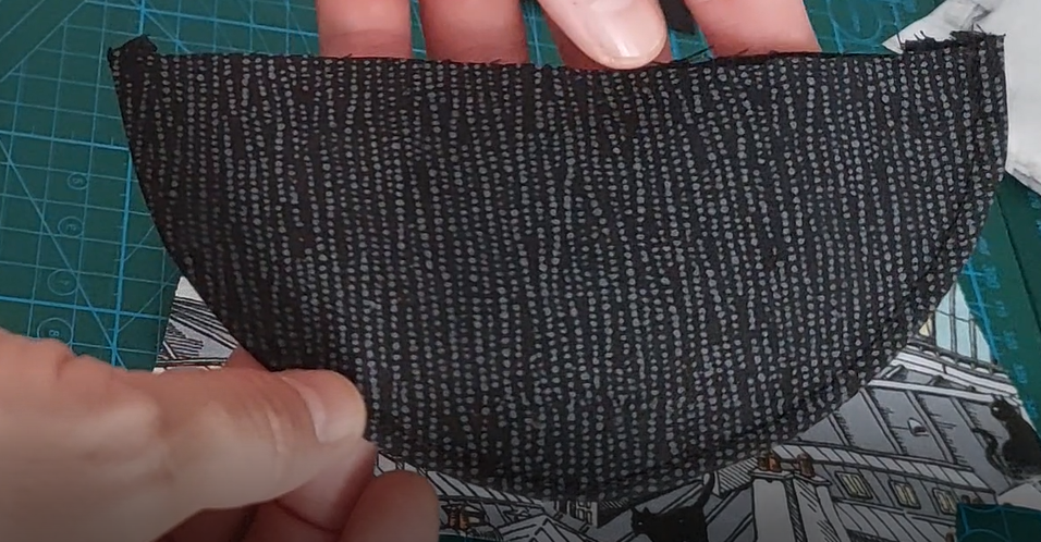 Para la solapa, he utilizado una tela de algodón «tono sobre tono» de fondo negro y motitas grises, y para el interior un popelín de algodón de color negro.