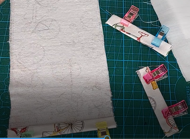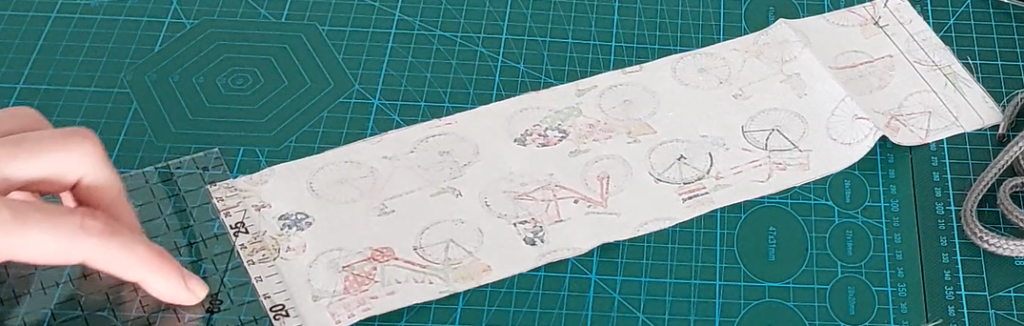 Las dos piezas de tela exterior de 10cm de alto, que son para la parte superior de la mochila, las vamos a doblar a dos centímetros por cada lado y esos dos centímetros sobre sí mismos, para hacer la costura de acabado. (Si no me entiendes bien, mira el vídeo).