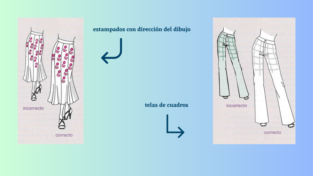 Cuando la tela tiene un estampado «con sentido», debes colocar las piezas del patrón sobre la tela de manera que los bordes inferiores estén en la misma dirección, de esta manera evitamos que cada dibujo esté en una dirección.