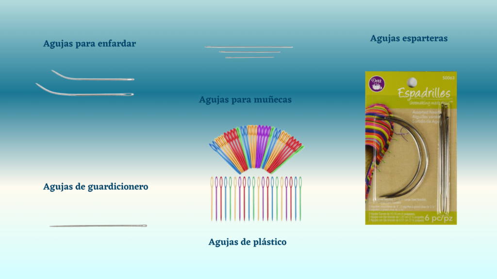 Cuando no tienen punta se llaman de tapestry y se utilizan para tejidos con trama agujereada como cañamazos, panamás, esterillas…