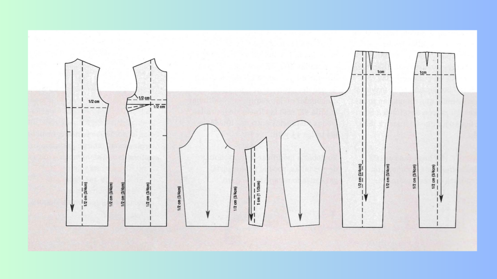 En el siguiente dibujo se muestra cómo trazar las líneas de modificación verticales y horizontales en las diferentes piezas del patrón.