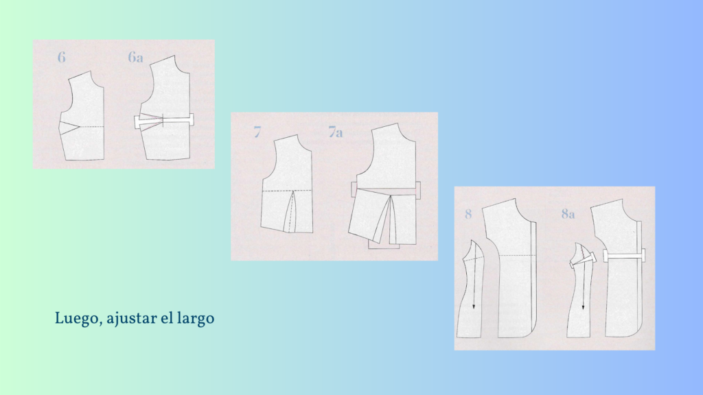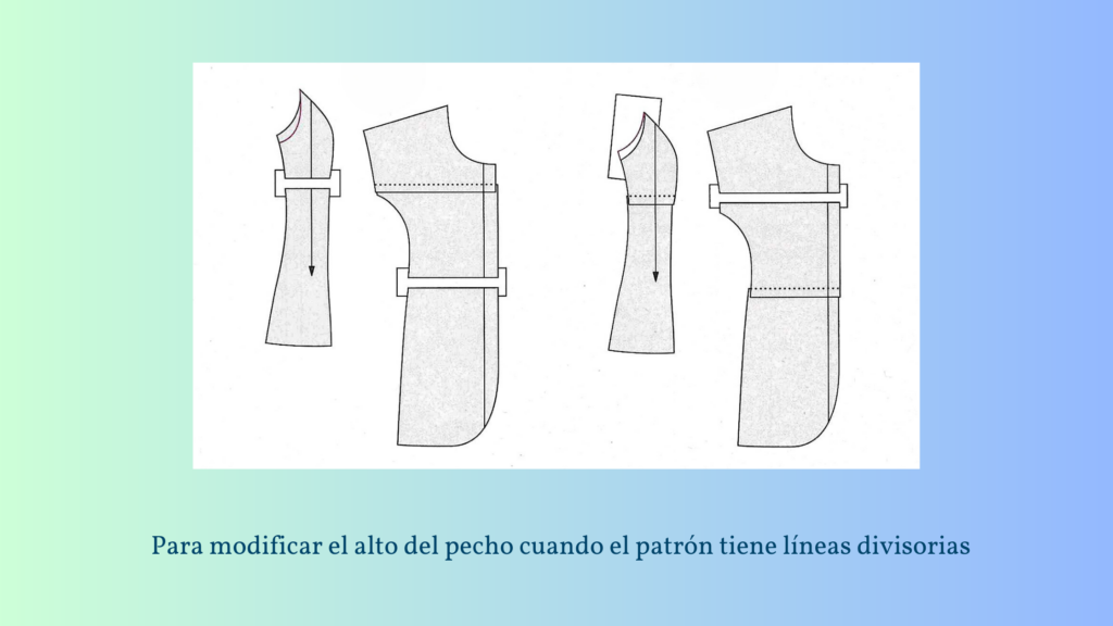 De esta forma, si hay que subir el punto del pecho (porque nuestro largo de pecho es menor) acortaremos en la línea superior y añadiremos en la línea inferior los mismos centímetros para que quede equilibrada.