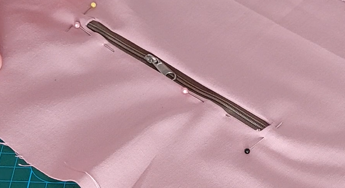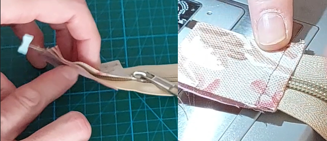 Cogemos las piezas de tela de 4x6cm y colocamos a ambos extremos de la cremallera, enfrentando los derechos.
