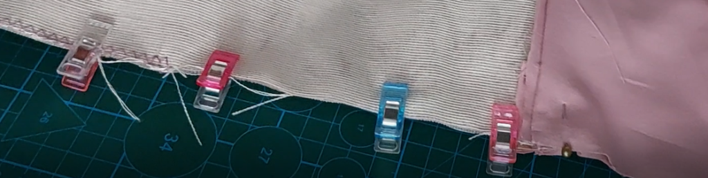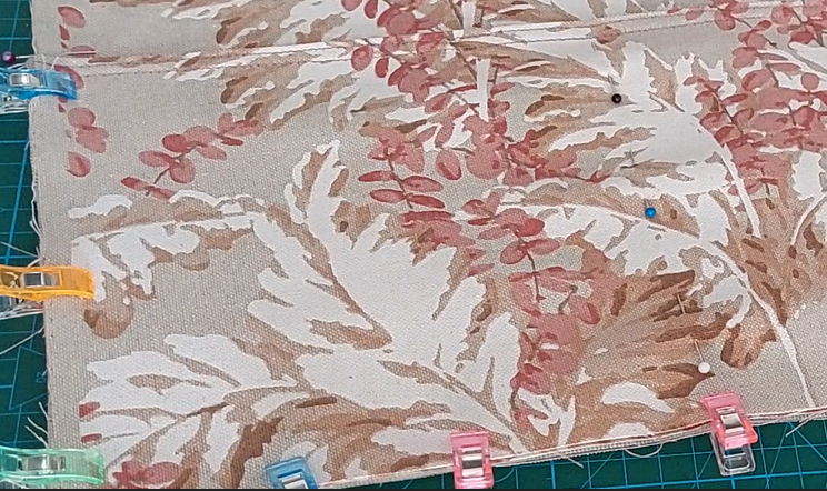 Colocamos encima una de las piezas de tela interior (asegúrate de que estén derecho contra derecho las dos piezas de tela), volvemos a sujetar con las pinzas.