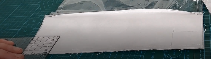 Antes de colocar la segunda pieza, marcamos un centímetro en el extremo inferior y pasamos la plancha para marcarlo ¿para qué? para tapar la costura interior cuando giremos la tela.