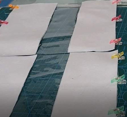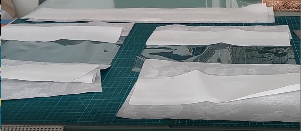 Para la parte inferior del bolso utilizaremos 4 piezas de algodón de 30cm de ancho y 12cmde alto y dos piezas de entretela dura o rígida de 30 cm por 12 cm de alto