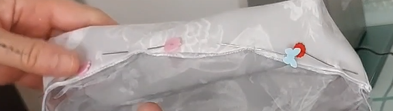 Para finalizar, colocamos la parte que hemos hecho para «tapar las costuras», con cuidado la sujetamos con alfileres por la parte de la tela y no del plástico y con mucha paciencia le damos un pespunte con la máquina.