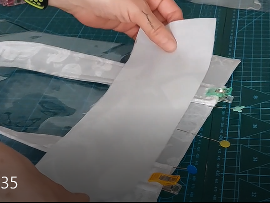 Colocar las piezas inferiores y superiores (coloca el derecho de la tela hacia el plástico) y sujetar con pinzas, coser con un margen de un centímetro aproximadamente.